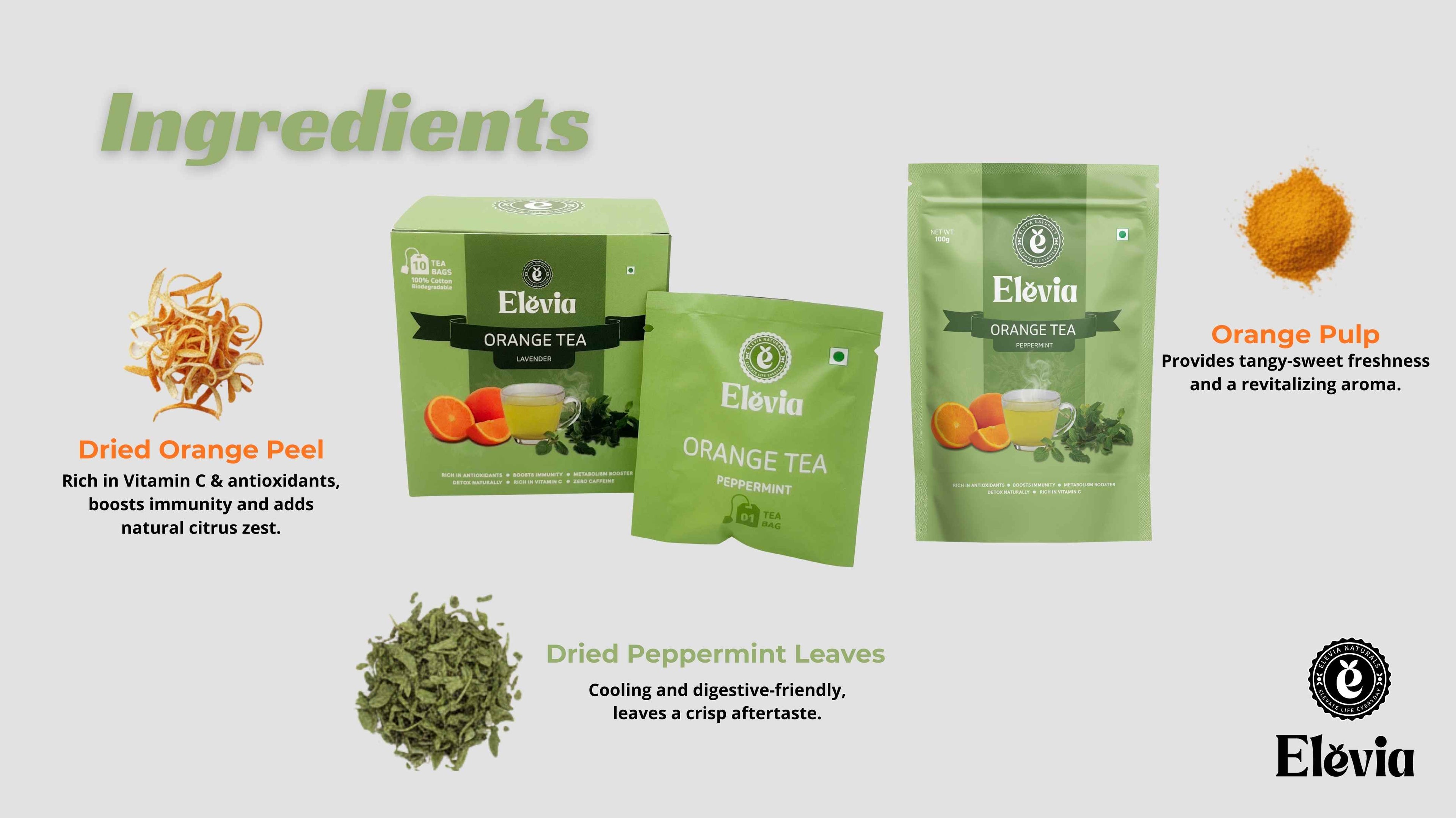 Elevia Orange Mint Fresh is more than just tea – it’s a cooling detox drink that refreshes, recharges, and revives your senses with every sip.